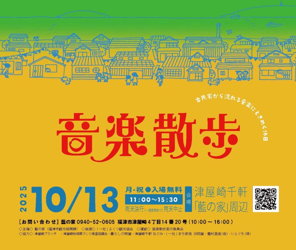 イベント 【終了しました】┃10月13日(月・祝)┃音楽散歩┃津屋崎千軒「藍の家」周辺 2025.09.08 古民家から流れる音楽にときめく休日。昔なつかしい町並みが残る津屋崎千軒の あちこちに、音楽が響く秋の一日を過ごしに出かけませんか。 詳しくはこちら Tweet Share Hatena Pocket RSS feedly Pin it 【終了しました】10月12日(日)┃手づくり市┃津屋崎千軒「藍の家」周辺 前の記事 【終了しました】10月19日┃「プリンセス駅伝in宗像・福津」にともなう交通規制のお知らせ 次の記事