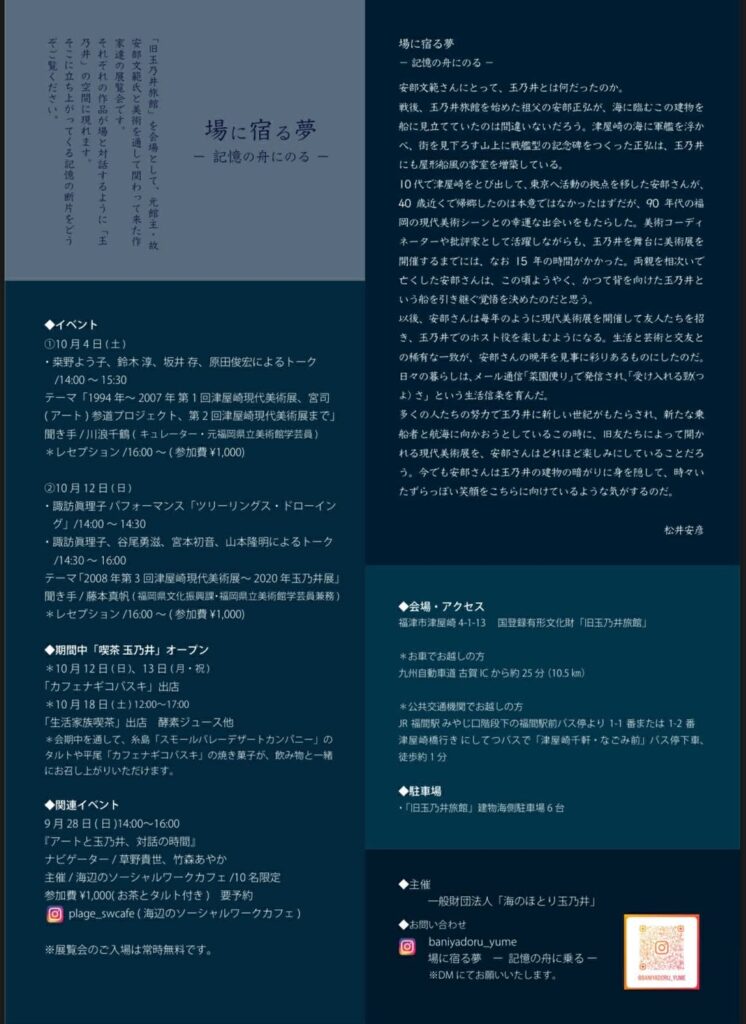 9月27日(土)〜10月26日(日)まで、津屋崎の「旧玉乃井旅館」にて、22名と1組の現代美術作家による展覧会を開催いたします。