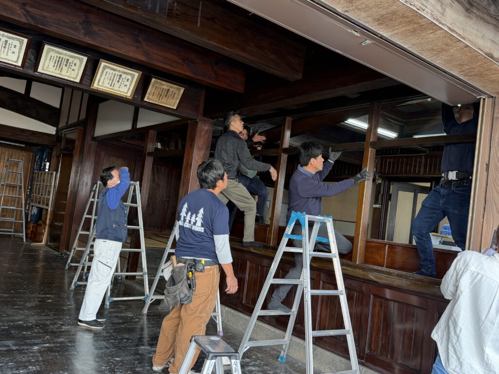 福津市津屋崎千軒の豊村酒造(国指定重要文化財)では、今年も10月30日に「冬支度」が行われ、ひかりのみちDMO福津は見学ツアーを実施しました。当日は、夏に取り外していた壁や柱、ガラス戸を冬仕様へ戻していく職人の作業を間近で見学し、普段は立ち入ることのできない非公開エリアも特別に案内されました。