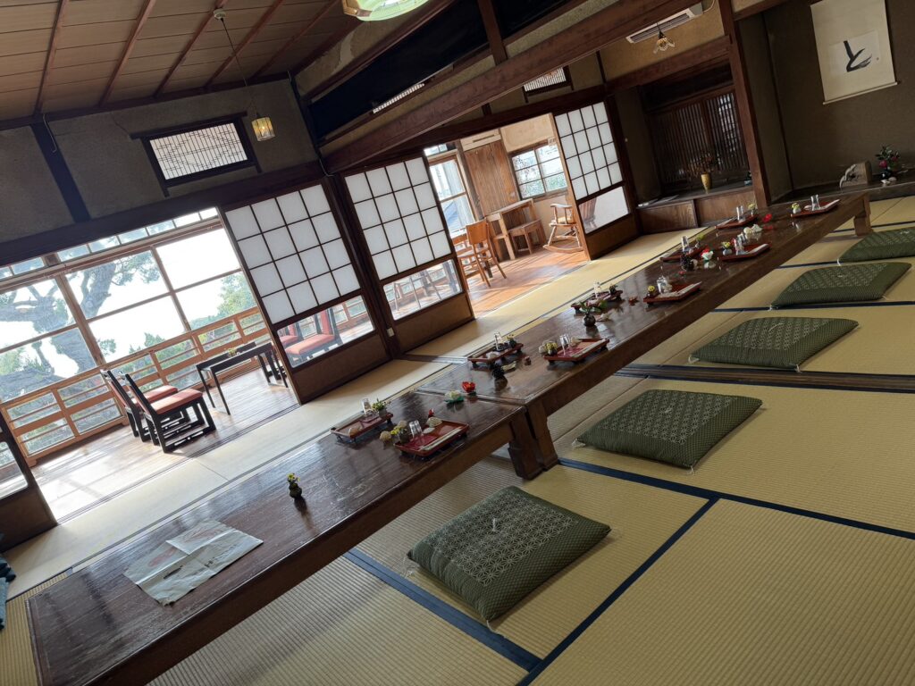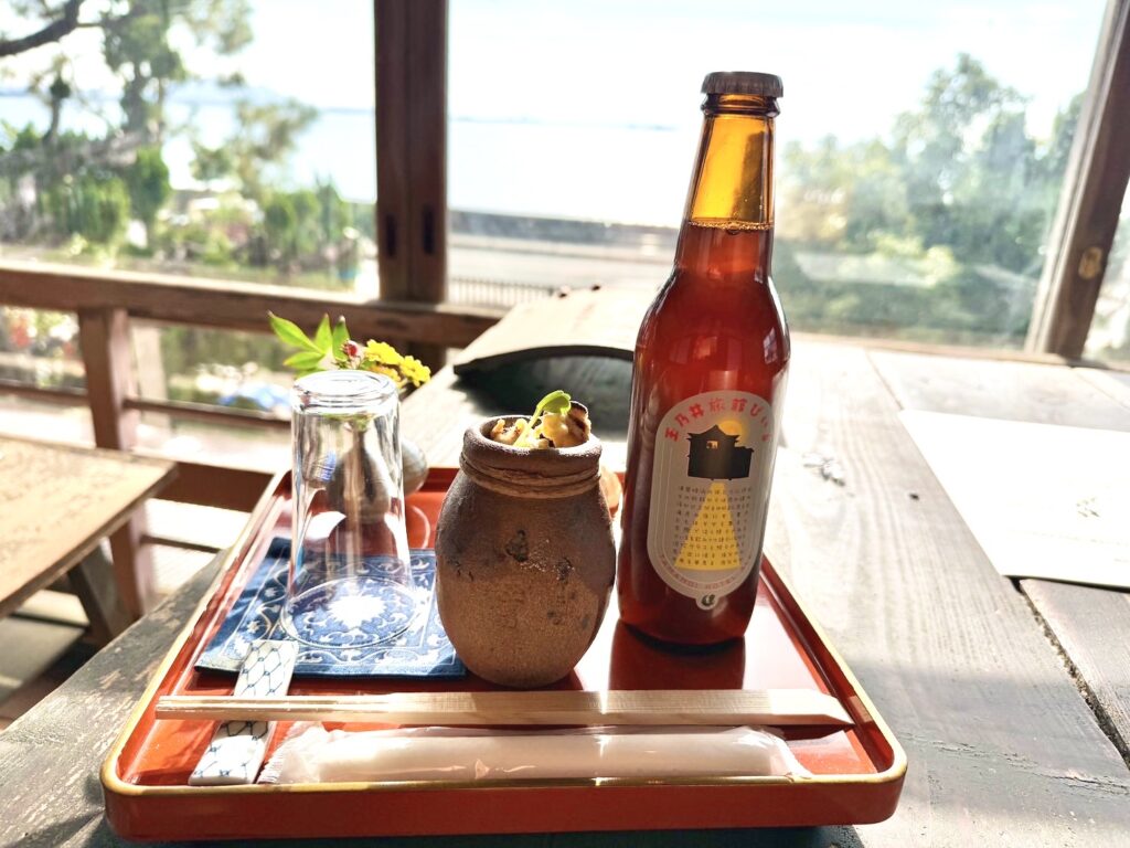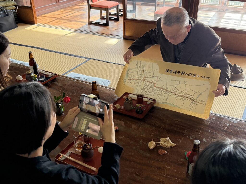 旧玉乃井旅館では、2階大広間へと案内しました。階段を上り、室内に足を踏み入れた瞬間、眼前に広がる玄界灘の大海原と、歴史ある建築空間が一体となった眺めに、参加者からは思わず感嘆の声が上がりました。大広間では、復刻された「タコツボ料理」や地元で醸造される玉乃井ビールを味わいながら、語り部による津屋崎の歴史にまつわる話を楽しみ、「景観・建築・食・物語が重なり合う体験が印象的」「その場に身を置くことで初めて理解できる魅力がある」といった声が聞かれました。