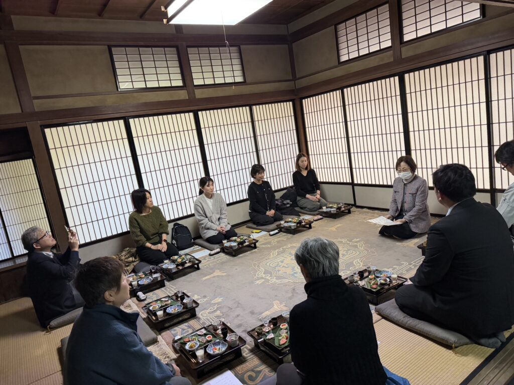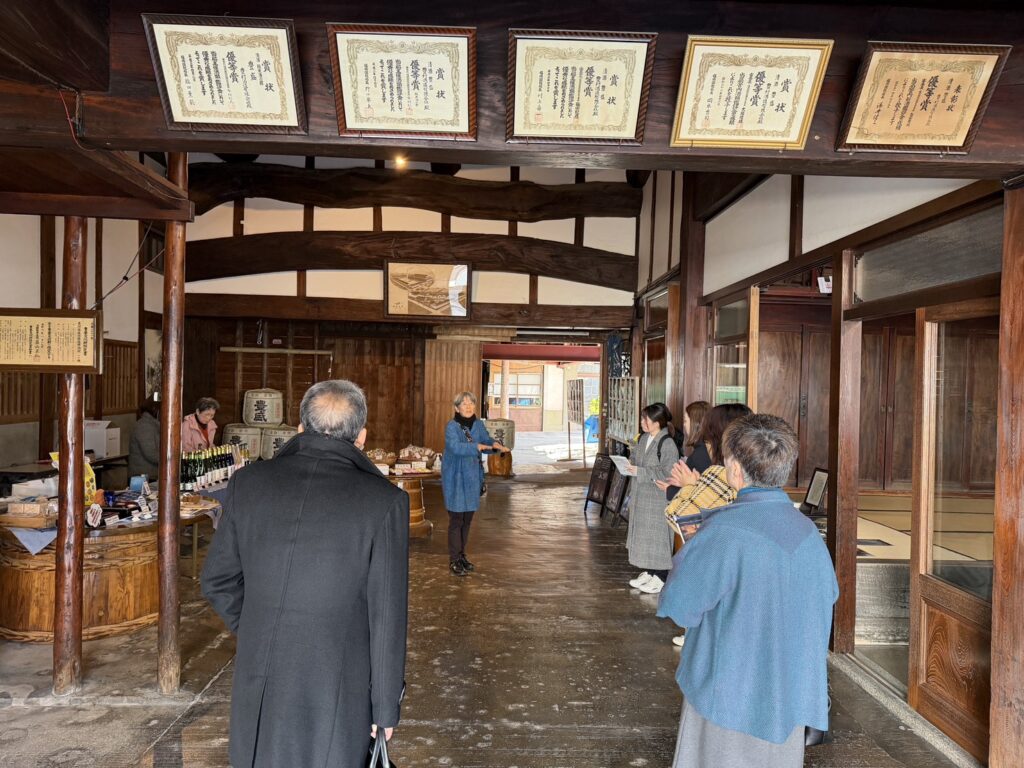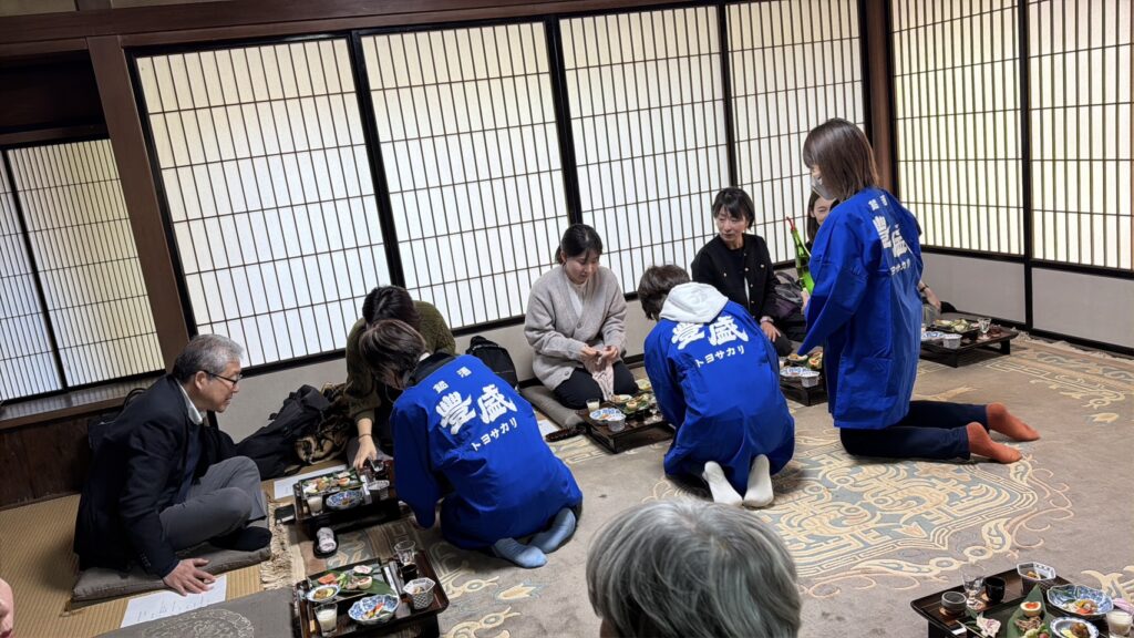 豊村酒造では、本ツアーの大きな特徴の一つである「祝膳」を体験していただきました。これは、2024年1月に国指定重要文化財に指定された豊村酒造において初めて行われた取り組みで、蔵元に代々伝わる料理のレシピをもとに構成された祝いの膳です。酒造りの過程で生まれる酒粕を用いた料理の数々を通して、酒蔵文化と食の深い関係性を感じられる内容となっており、「土地の歴史が料理として表現されている」「酒蔵ならではのもてなしに触れられた」といった声が聞かれました。また、これまで一般には公開されてこなかった本座敷で食事をいただく体験に、特別な価値を感じたという感想も寄せられました。