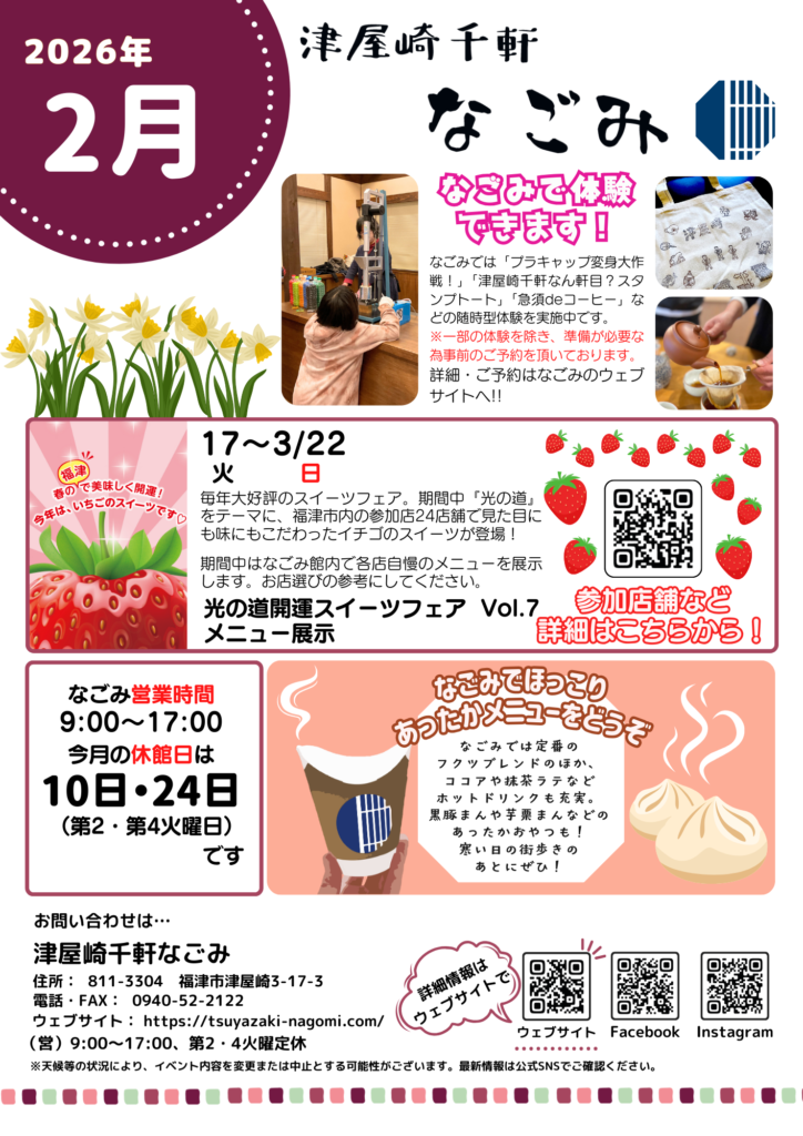 江戸時代から海上交易と塩田で栄え、かつて家が千軒もひしめくようだったことから「津屋崎千軒」と呼ばれるようになったまち。そんな津屋崎千軒の観光拠点として、まちのロビーのような役割を果たしている観光案内所「津屋崎千軒なごみ」です。観光案内のほか、小さなカフェや体験プログラム、レンタサイクルなども行っています。