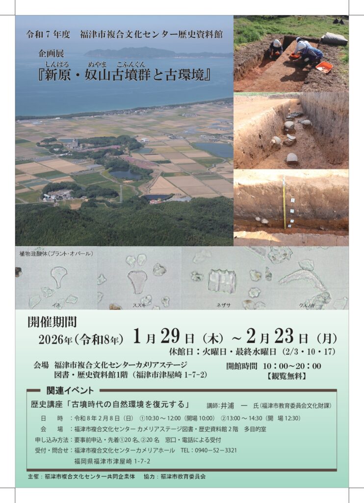イベント 2月23日(月)まで┃企画展「新原・奴山古墳群と古環境」┃福津市複合文化センター(カメリアステージ) 2026.02.01 【企画展】 ■開催期間:1月29日(木)~2月23日(月) ■会場:福津市複合文化センター(カメリアステージ) 図書・歴史資料館1階 ■開館時間: 10:00~20:00 ■観覧無料 【関連イベント】 ■歴史講座「古墳時代の自然環境を復元する」 ■日にち:2月8日(日) ■時間:①10:30~12:00(開場10:00) ②13:00~14:30(開場12:30) ■会場:図書・歴史資料館2階 多目的室 ■講師:井浦 一 氏(福津市教育委員会文化財課) イベント詳細はこちら Tweet Share Hatena Pocket RSS feedly Pin it 2月の津屋崎千軒なごみカレンダー 前の記事 2月19日┃意外とフクツ?ひみつ基地in博多駅┃JR博多駅構内 次の記事