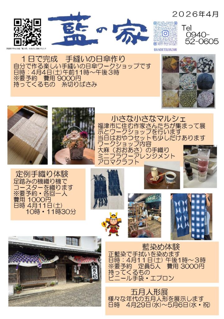 イベント 4月の藍の家スケジュール 2026.03.31 明治34年に建築された、国の有形文化財に登録されている津屋崎千軒民俗館「藍の家」のカレンダーが届きました! 藍の家Facebook Tweet Share Hatena Pocket RSS feedly Pin it 5月30日┃JRウォーキング「宮地嶽神社の菖蒲まつりと津屋崎千軒めぐり」┃福津市内 前の記事 4月のふくつ観光協会(ふっくる)スケジュール 次の記事