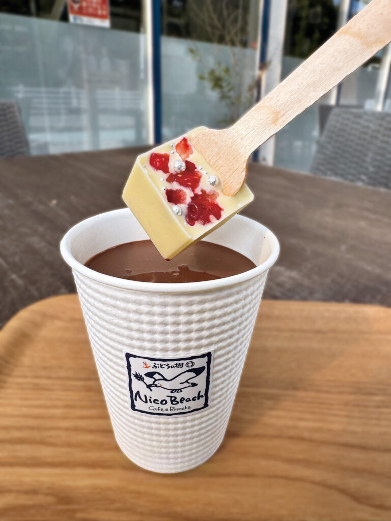 上品なホットチョコに、いちごをトッピングしたホワイトチョコを溶かしながら、味の変化を楽しむのもおすすめ!