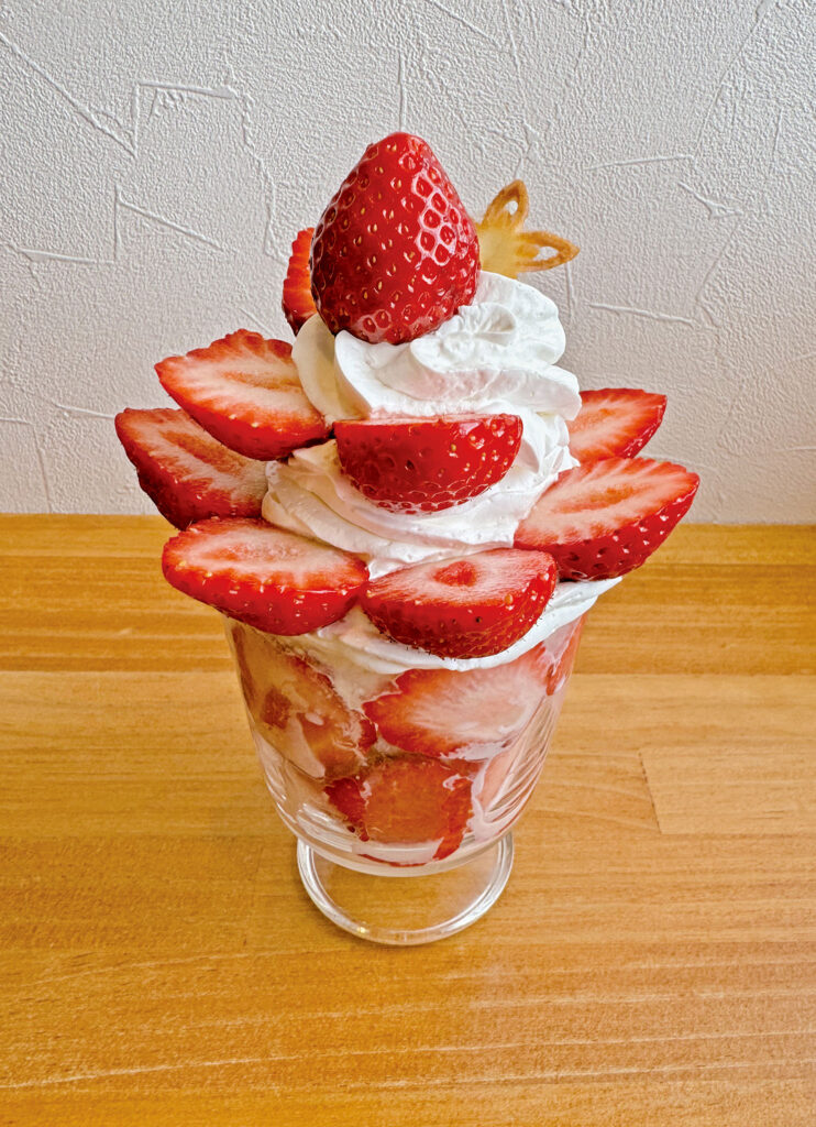 光の道をイメージしたパフェ。福津産あまおうと豆乳ベースのピンス、2種のクリームで甘さ控えめなパフェです。