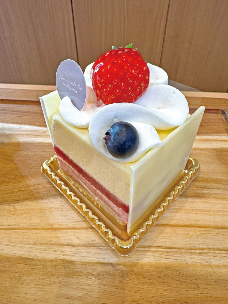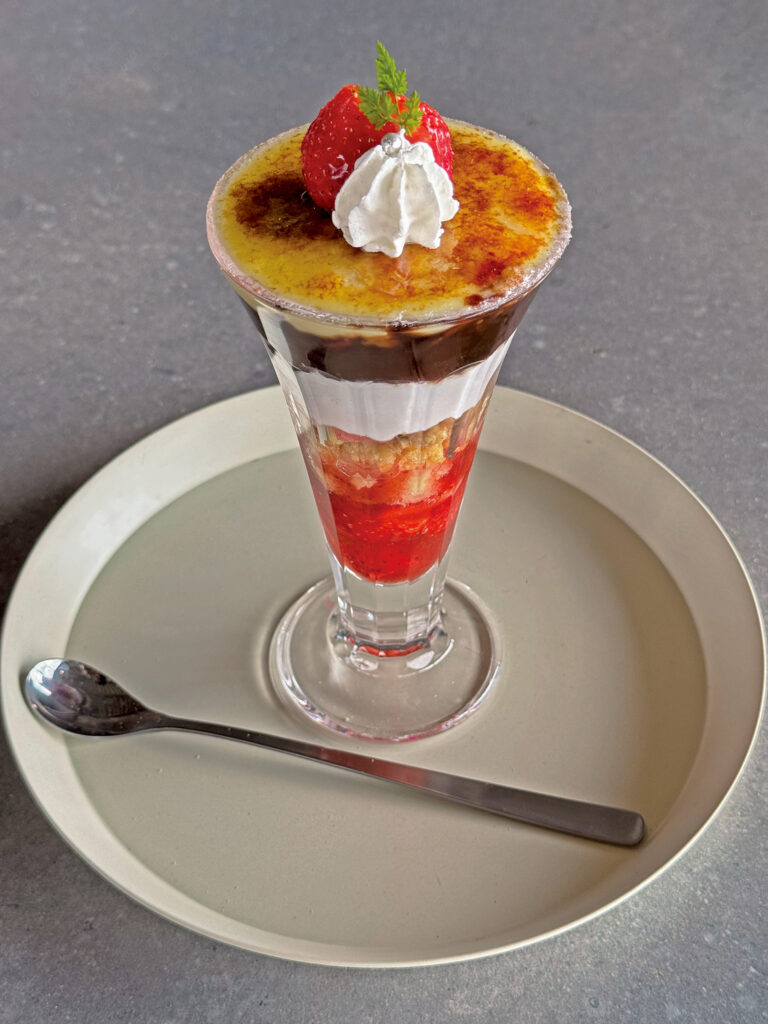 光の道をイメージしたパフェ。福津産あまおうと豆乳ベースのピンス、2種のクリームで甘さ控えめなパフェです。